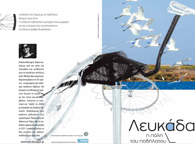 Αυτά είναι τα ποδήλατα της Καίτης Ματαφιά Χόρτη, της ευρηματικής καλλιτέχνιδας που έρχεται να μας υποβάλλει μια νέα αισθητική ανάγνωση του λευκαδίτικου τοπίου και να μας παρασύρει στην ευαίσθητη αγωγή ενός εμπλουτισμένου βλέμματος εικαστικών μεταμορφώσεων. Μας καλεί σε μια «παρά θίν’ αλός» ρομαντική ανακάλυψη της ευαίσθητης πρόσληψης της μικρο-ζωής, της ενόργανης σιωπής των μικρών και ασήμαντων, που δεν φωνασκούν την ύπαρξή τους, αλλά την ψελλίζουν στον καλλιτέχνη κι εκείνος διαμεσολαβεί σε μας για την κατανόηση, την οικείωση με την ύπαρξή τους.